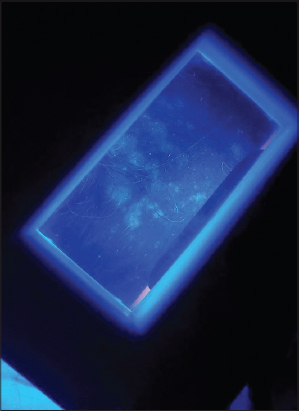 A forty-nine-year-old diabetic male presented with asymptomatic, rapidly growing, leukodermal patches on the scalp (Fig. 1), which began to appear suddenly fourteen days following the administration of the first dose of the Oxford–AstraZeneca (AZD1222) vaccine against severe acute respiratory syndrome coronavirus 2 (SARS-CoV-2). The patches were clinically consistent with vitiligo and were confirmed with their well-defined, ivory-white patches by Wood’s lamp examination (Fig. 2).